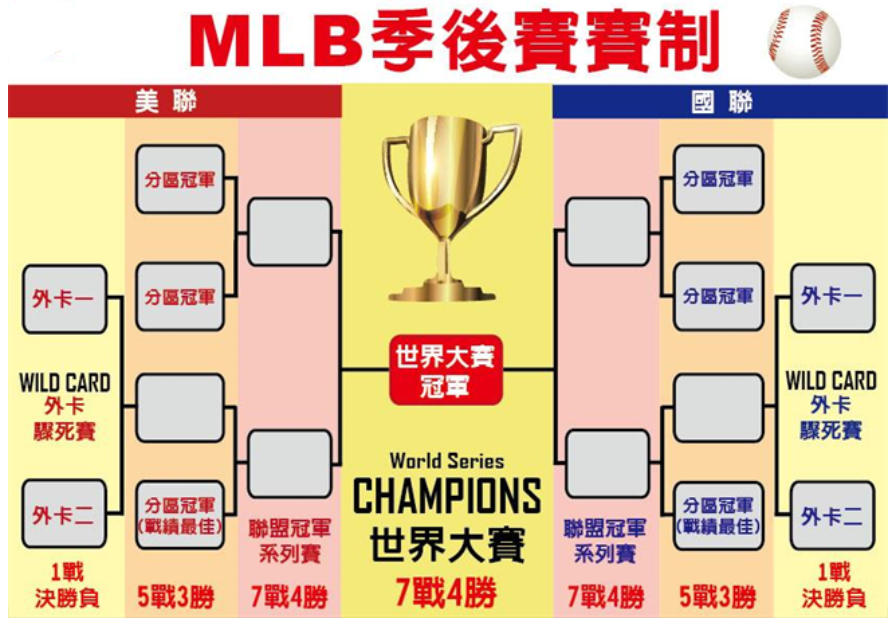 各聯盟的「外卡」第1、第2名的球隊會先進行1場淘汰殊死戰,輸就淘汰贏就晉級,一次定生死;勝方與其他3個分區冠軍共4支隊伍再分組進行第一輪5戰3勝的系列戰,獲勝方得再接續進行第二輪7戰4勝的聯盟冠軍戰,再次獲勝的隊伍直接進入第三輪7戰4勝的世界大賽。