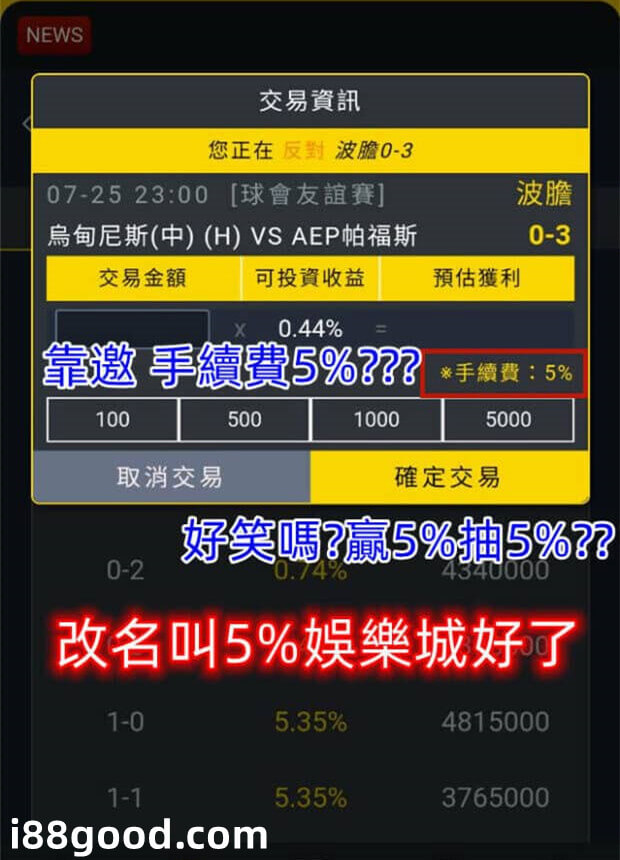 還有一個東西叫做反波膽,也就是預測不會出現的比數,坦白來說,這就是詐騙,畢竟勝率高達9成以上的東西,賠率根本不會高到哪裡,賠率最高也才1.1,其餘的也才1.002~1.03,結果下注還要跟你收手續費......。