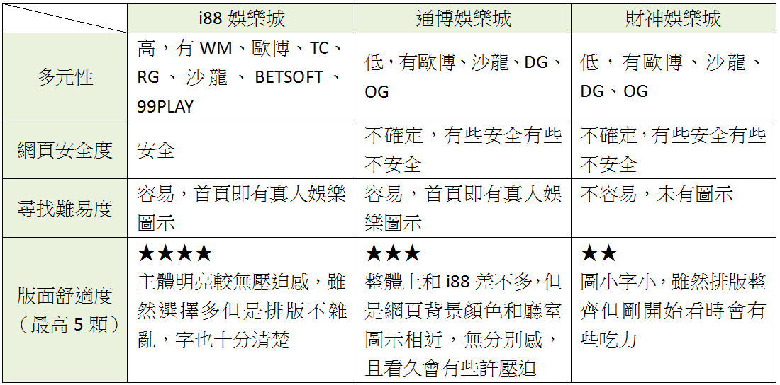 分析下來,TU娛樂城不僅提供多元的真人百家樂廳室做選擇,更有著舒適的操作版面,更重要的是─安全,和另外兩家相比,TU娛樂城的安全性是不需要特別花心思去注意的,因為「安全」我們絕對做到,讓玩家放心、安心、開心的玩。囊括了多元有趣和安全的TU娛樂城,無非是您的最佳首選!
