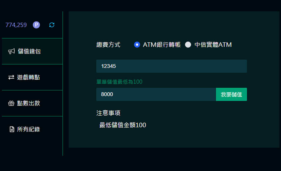 主動聯繫客服中心申請儲值,並告知方式及金額等待客服開單即可!由於是使用客服人工開單,所以會有些許麻煩,但是這種方式會比在網站上填寫資料安全許多!