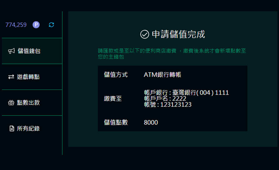 2.申請儲值完成!接著依照選擇的付款方式付款即可