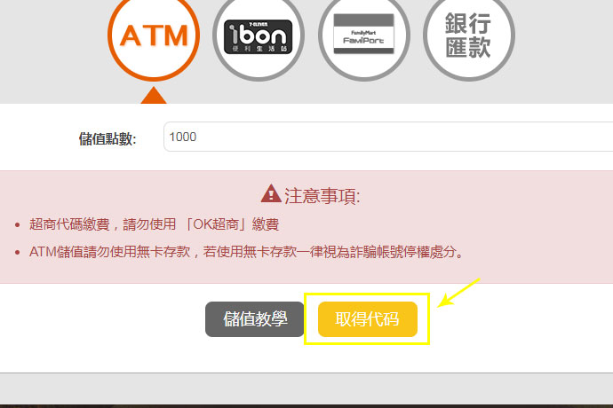 1.在儲值畫面中輸入您要儲值的點數,金額輸入完後會出現多種付款方式供您選擇,確認金額跟付款方式後按下「我要儲值」