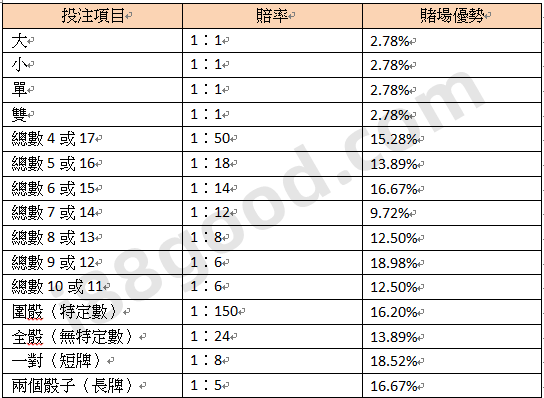 - 雙骰:6.94%,賠率1:2。