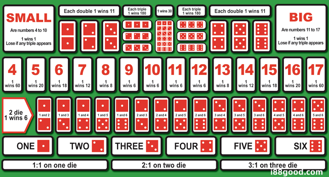 - 單骰:下注某個數字會出現1/2/3次,假設下1會出現1次,開出了1、4、4,那麼就是中獎;若是開出1、1、6,就是沒有中,要剛好才可以。