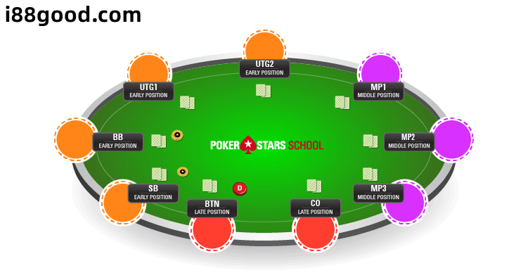 - 靠前:按鈕位左側的4個位置,分別為:SB(小盲)、BB(大盲)、UTG1(槍口)、UTG2這四個位置,其中前兩個位置是最不具優勢的位置。