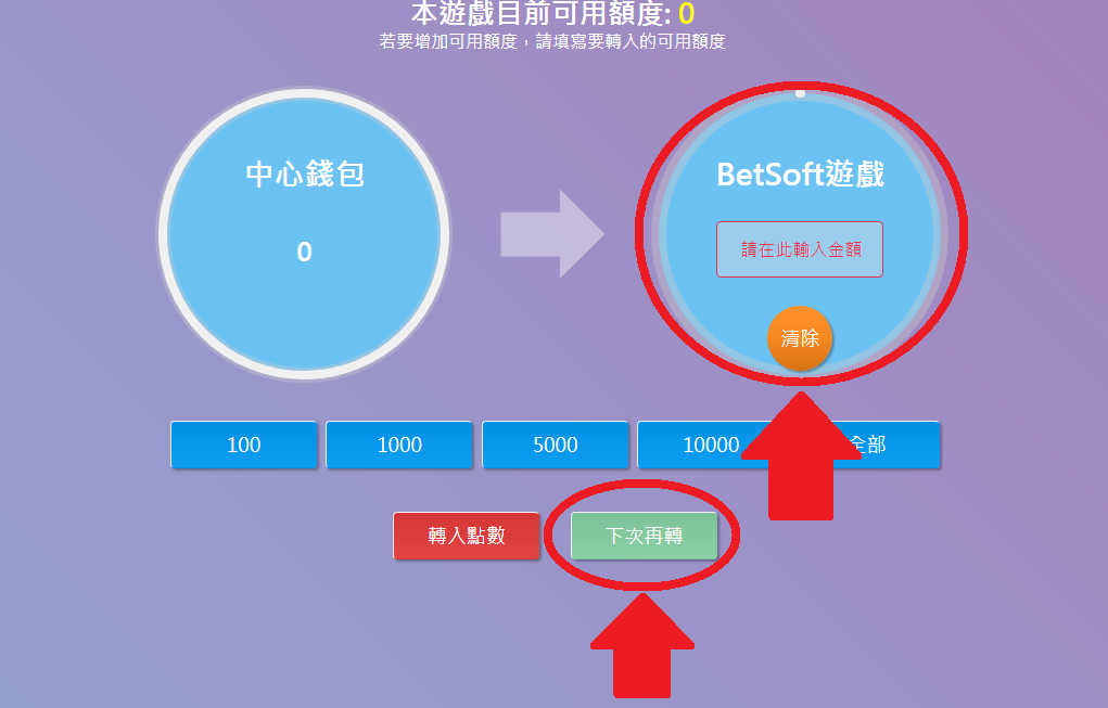 進入遊戲畫面後,即可開始遊戲,紅色圈裡的表示你所想下注的金額籌碼;