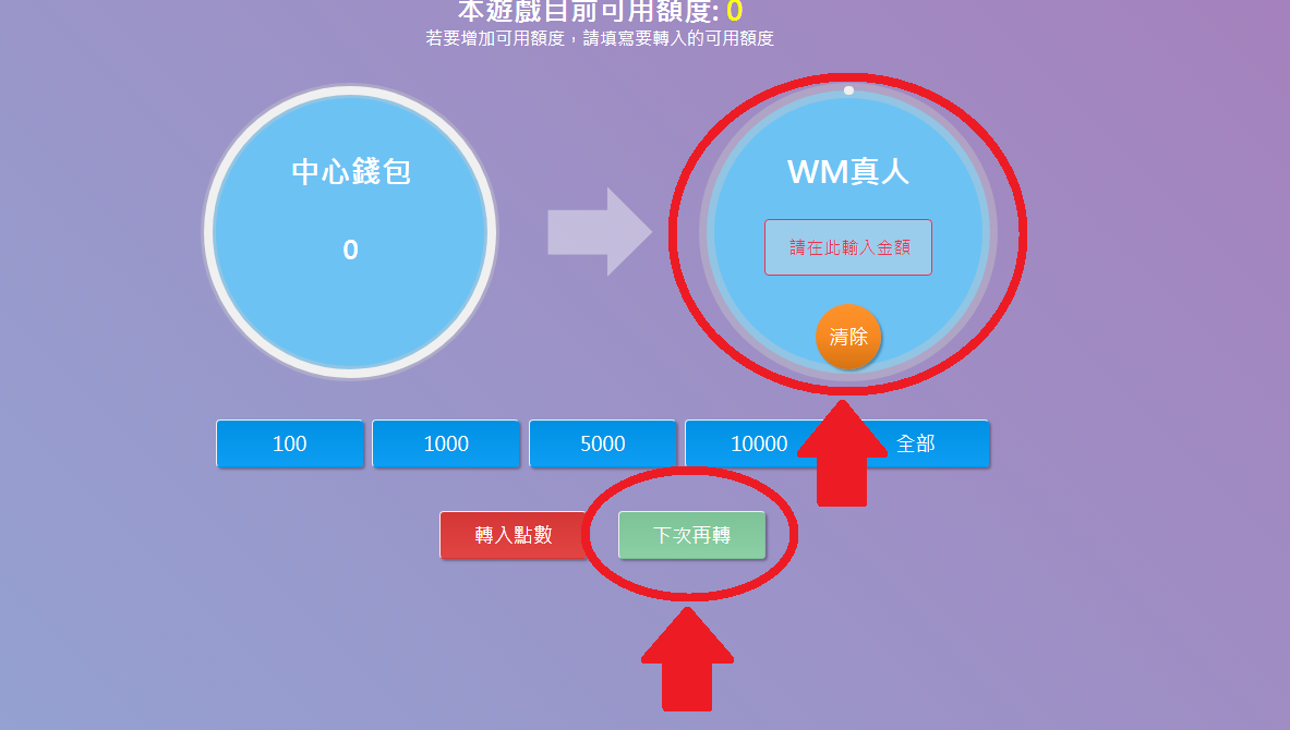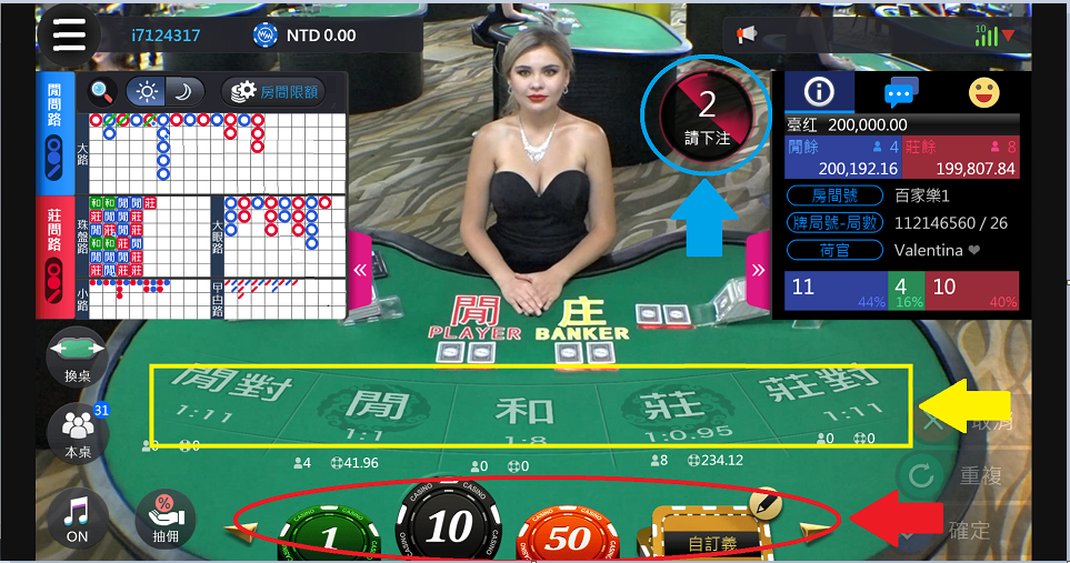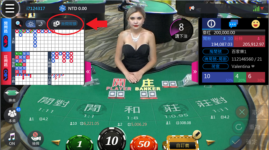 選好限額後即可開始下注,紅色圈裡的表示你所想下注的金額,可以選設定好的或是自定義;