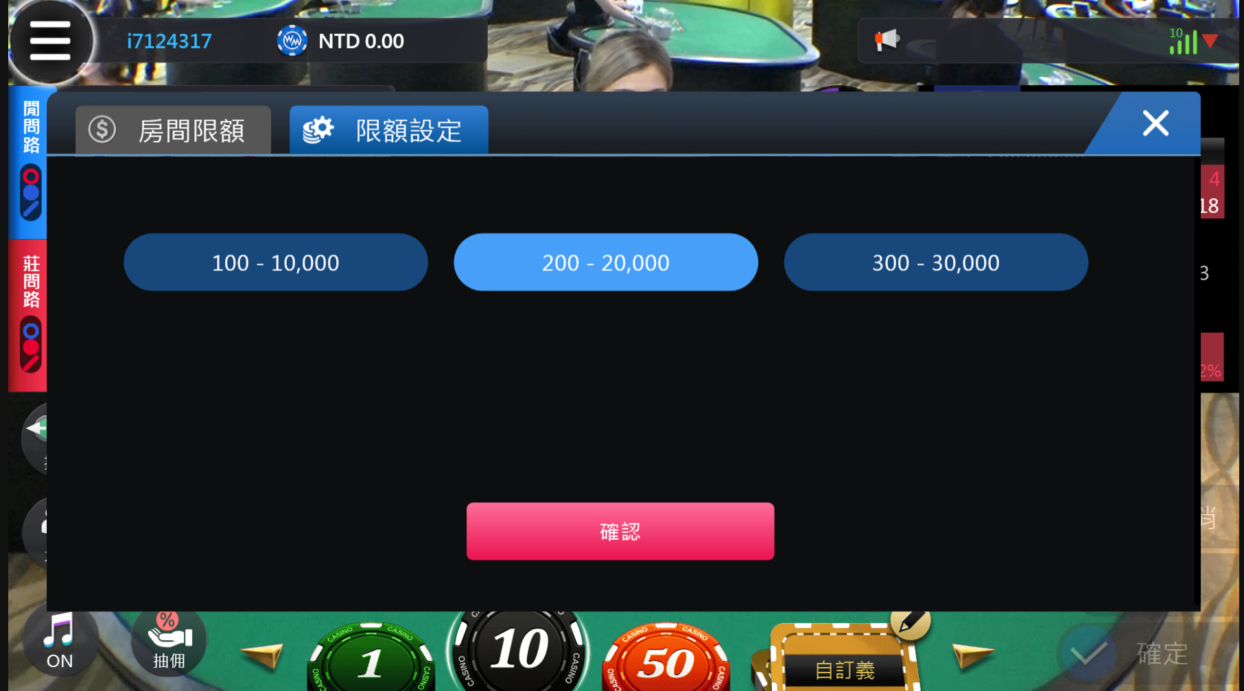 進入想要的牌桌後,可先選擇『房間限額』,選擇所需要的『限額設定』和『房間限額』